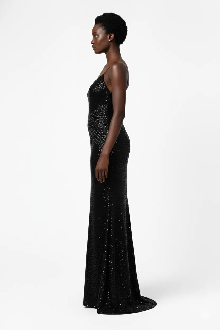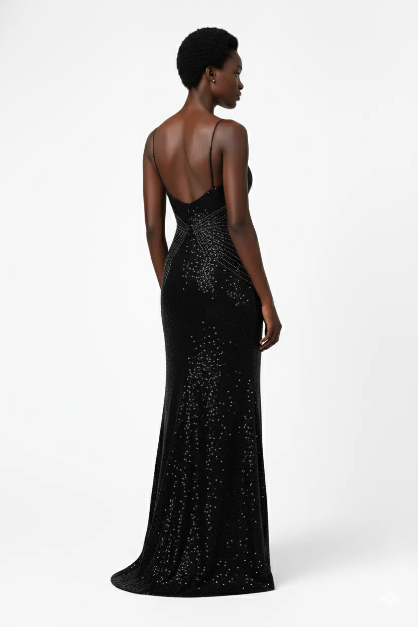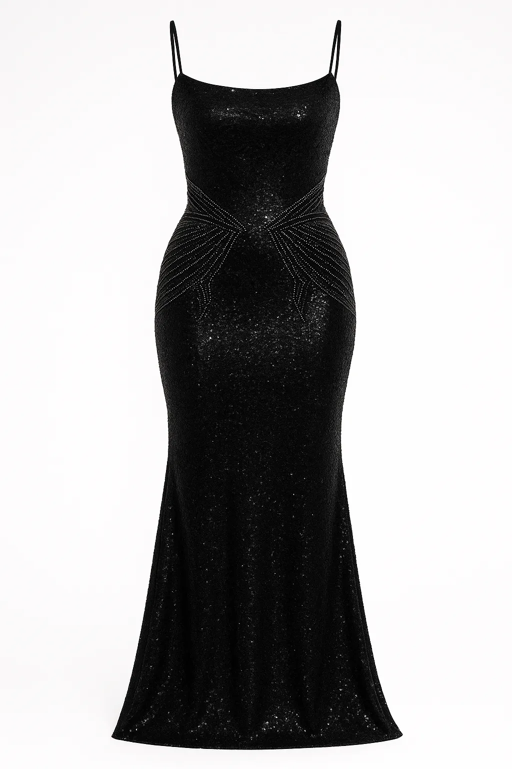 The Celeste Radiance Gown features a gracefully structured bodice with delicate spaghetti straps and a flattering V-neckline. Its standout feature is the intricate geometric beadwork and sequin detailing that artfully defines the waist and hips. This exquisite embellishment creates a captivating, figure-enhancing design, drawing the eye and adding a unique dimension to the classic black sequin gown.