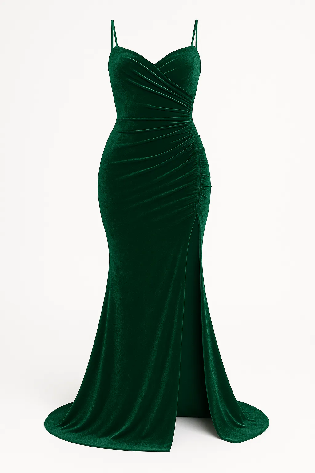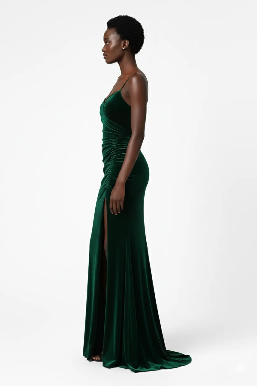 Step into timeless sophistication with the Azara Emerald Elegance Draped Velvet Gown. Crafted from premium stretch velvet in a rich jewel-toned emerald green, this gown combines luxury and allure in every detail. The design features delicate shoulder straps and a flattering ruched bodice that sculpts the waist for an hourglass silhouette. A daring thigh-high slit adds movement and sensuality, while the sweeping mermaid hem ensures an unforgettable entrance at any occasion.